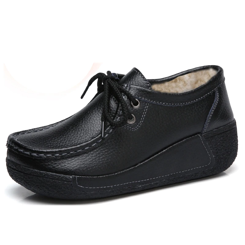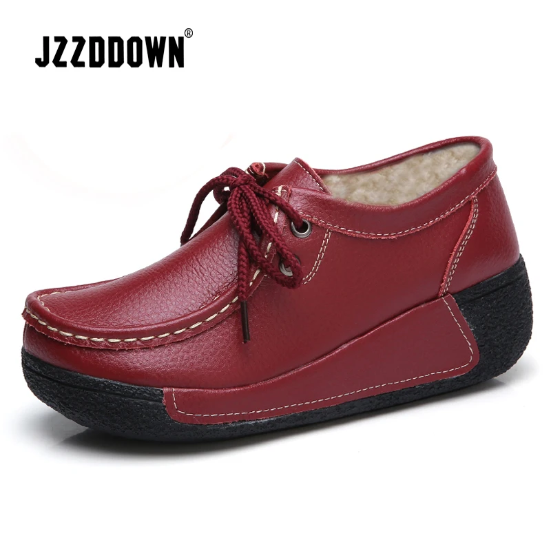 JZZDDOWN Soft Genuine Leather shoes woman winter plush Heel High 3cm women shoes flat with fur Ladies female shoes flat